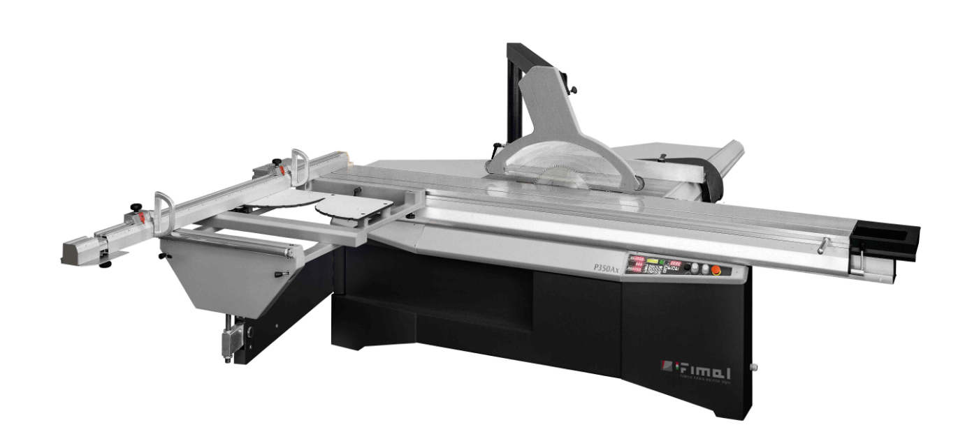 The extension-table fence can be quickly set from +45° to -45° with fixed references at each 5° and at 22°30. The saw guide, slides along a bar on four wheels. The guides can easily be excluded from the work table if necessary for sawing large panels.