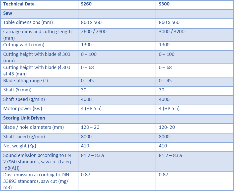 The saw guide, with micrometric adjustment, slides along aluminium profiles by means of wheels and can easily be excluded from the work table, by rotation, for sawing large sized panels.